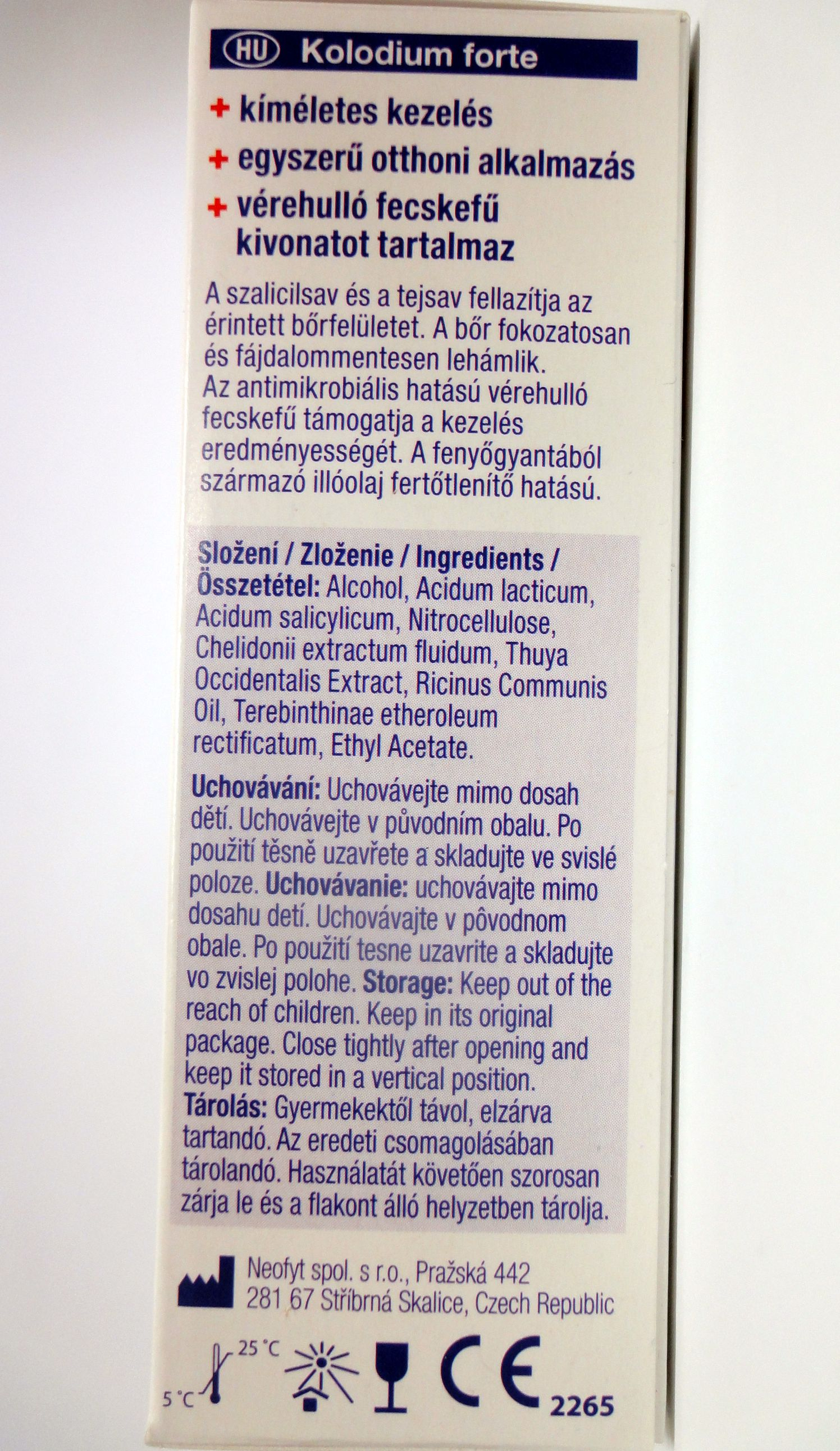 Spôsob použitia: Tehotné alebo dojčiace ženy by mali prostriedok používať po konzultácii s odborným lekárom. Nepoužívajte u detí mladších ako 3 roky. Deti mladšie ako 15 rokov by mali prostriedok používať pod dozorom dospelých. Pacienti trpiaci cukrovkou by mali užívanie prostriedku konzultovať so svojím ošetrujúcim lekárom. Osoby s citlivou pokožkou by mali prostriedok používať s opatrnosťou a jeho účinok najprv overiť na malom povrchu postihnutého miesta po dobu 2-3 dní. Nepoužívajte prostriedok v prípade alergií alebo precitlivenosti na niektorú z jeho zložiek. Aplikuje sa podľa veľkosti postihnutého miesta, zvyčajne v množstve 1-3 kvapky 2 krát denne. Nanášame najlepšie špachtličkou na uzáveru priamo na postihnuté miesto. Pri aplikácii na väčšie plôšku prostriedok rovnomerne rozotrieme. Po nanesení roztok rýchlo vyschne a vytvorí na povrchu pokožky biely film. Ak sa prostriedok nanáša na miesto, z ktorého sa rýchlo zotrie (napr. Na chodidlo a pod.), Je možné miesto po zaschnutí prípravku prekryť náplasťou. Aplikácia sa vyko- hovorí opakovane, až sa nechá zrohovatená kože bezbolestne odstrániť. Prostriedok aplikujte len na postihnuté miesto, aby nedochádzalo k presahu na okolitú zdravú pokožku. Aj keď nebudú po prvých aplikáciách zjavné známky pôsobenia, nezvyšujte množstvo ani frekvencia aplikovaného prostriedku. Pôsobenie prostriedku je individuálna. Prvé známky účinku môžu byť pozorovateľné až po niekoľkých dňoch. Pred odstraňovaním vrchnej vrstvy tkaniva najlepšie ponorte miesto na päť minút do teplej vody s prídavkom kuchynskej soli. Osušte a pokiaľ sa tkanivo samovoľne neuvoľní, opatrne obrúste povrch napr. Pemzou. Pozor, pri tomto postupe je možné preniesť kožné ochorenie napr. Vírusového pôvodu (bradavice), používajte preto vlastné hygienické pomôcky. Odporúčaná doba súvislého používania nemá presiahnuť 10 dní. Opakované použitie na rovnakom mieste je možné začať až po 5-7 dňoch.