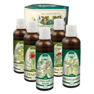 Súčasne kvapkať kotvičník T19, feminu T9, jarabinu vtáčiu T15 a brezové jahňady P3, po využití fľaštičky brezových jahniad užívate spolu T19+T9+T15+P10 a všetko doužívať.