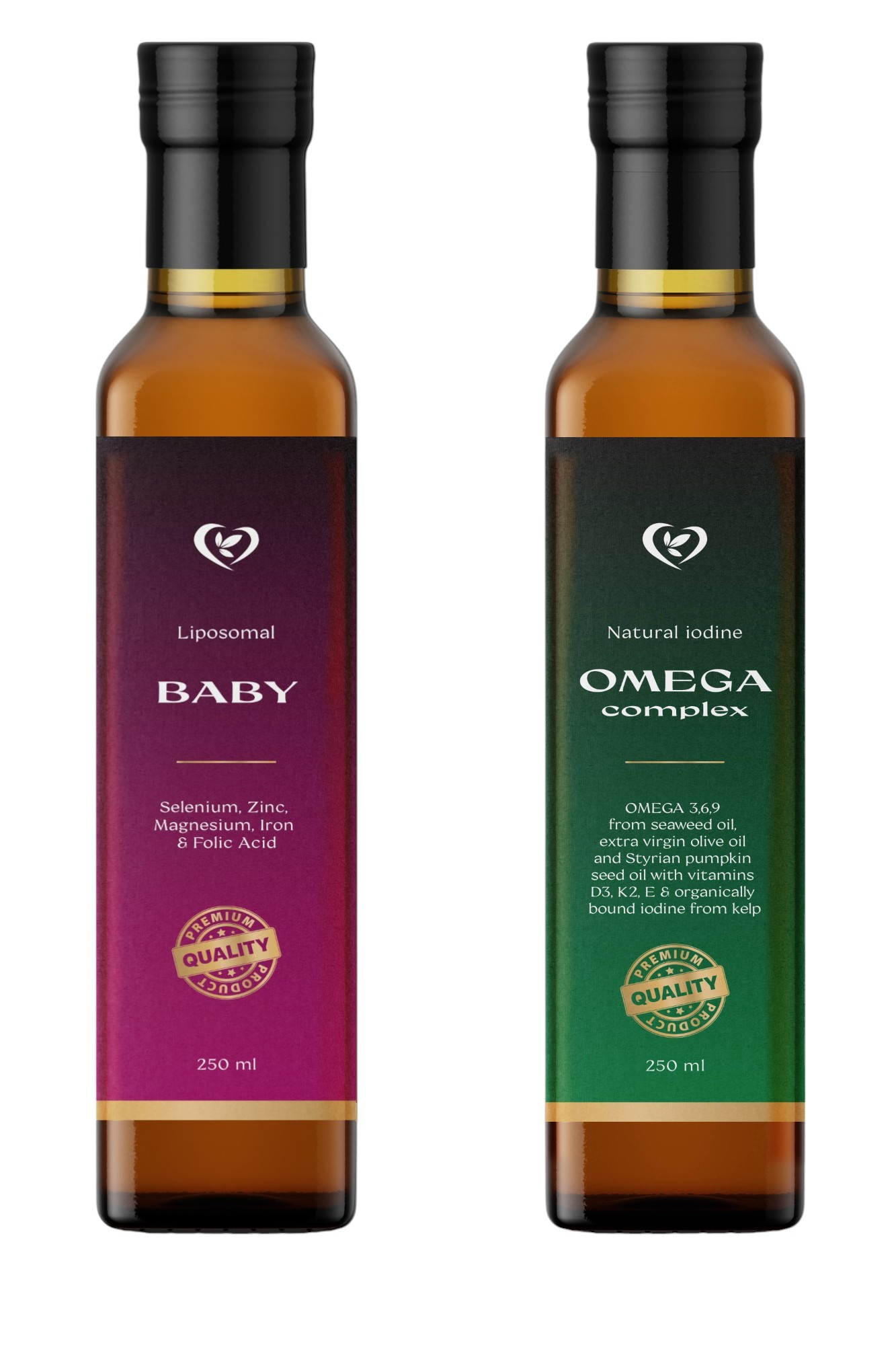 Olej z morských rias, extra panenský olivový olej a štajerský tekvicový olej ako zdroje Omega 3,6,9 s organickým jódom z kelpu, vitamínom E, vitamínom D3 a K2. Štajerský tekvicový olej, extra panenský olivový olej a olej z morských rias sú významné zdroje Omega 3,6,9.
